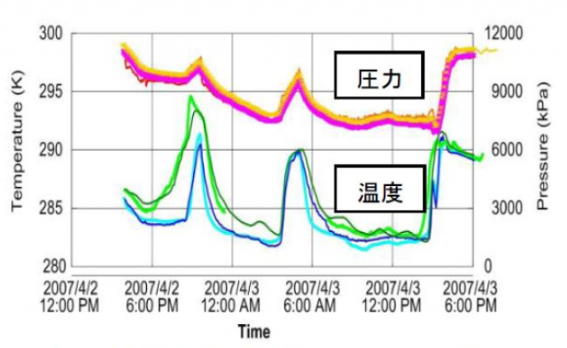 MH21によりカナダ北西部・マッケンジデルタ(永久凍土地帯)で実施された第2回陸上産出試験(2007年度及び2008年度実施)では、MH21-HYDRESによってガスと水の産出量予測が行われ、そのデータは坑内並びに地表機器の設計、作業指針の作成等に活用され、産出試験の成功に寄与しました。また、第2回陸上産出試験の中間検証、事後検証を行い、ガス・水生産挙動の解析・評価なども行いました。第2回陸上産出試験の第1冬試験については、生産期間が約12.5時間と短く、シミュレータの細部機能を十分に検証するには至りませんでしたが、出砂による坑井周辺地層の浸透率増加及び管内流動における非定常な流体流動を想定して貯留層パラメータを調整することによって、産出試験結果をマッチングシミュレーションにおいてほぼ再現しました(図2及び図3)。
